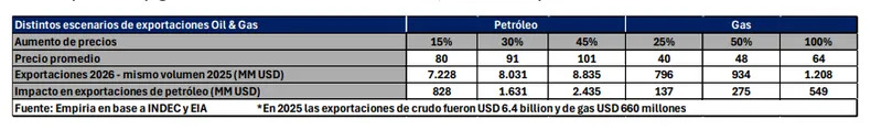 En este contexto, la consultora Empiria estimó que las exportaciones energéticas argentinas podrían aumentar en u$s 2985 millones, hasta alcanzar u$s 10.043 millones, un 40% más que en 2025, suponiendo volúmenes constantes.