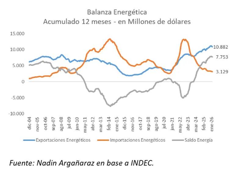 Además, en febrero de 2026 la balanza energética fue positiva en u$s 486 millones y explicó el 62% del superávit comercial del mes, con exportaciones por u$s 631 millones e importaciones por u$s 145 millones, según un informe del Instituto Argentino de Análisis Fiscal (IARAF).