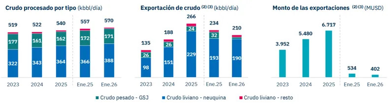 En 2025, la producción de petróleo aumentó 13% interanual, impulsada por la Cuenca Neuquina, mientras que las exportaciones crecieron 42% en volumen, según Economía y Energía. En enero de 2026, la producción volvió a expandirse 15,5% interanual.